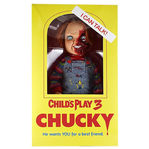 チャッキーのサイズは約15インチのディテールにこだわったフィギュアで、映画『チャイルド・プレイ3』で死神の大鎌でぶつかった後の切断された顔をリアルに再現♪